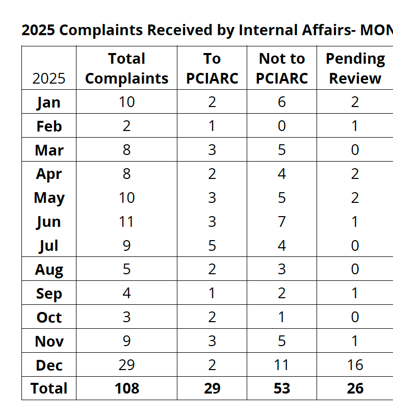 “I am disappointed that we are not able to deploy an independent investigator to review the civilian complaints,” said PCIARC Chair Erin Hayes during the meeting.